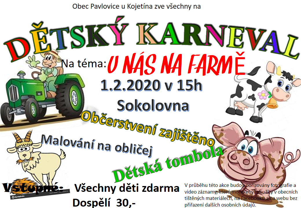 Obecní úřad Pavlovice u Kojetína zve všechny na dětský karneval na téma: U NÁS NA FARMĚ, v sobotu 1. 2. 2020 v 15:00 hodin v sokolovně.