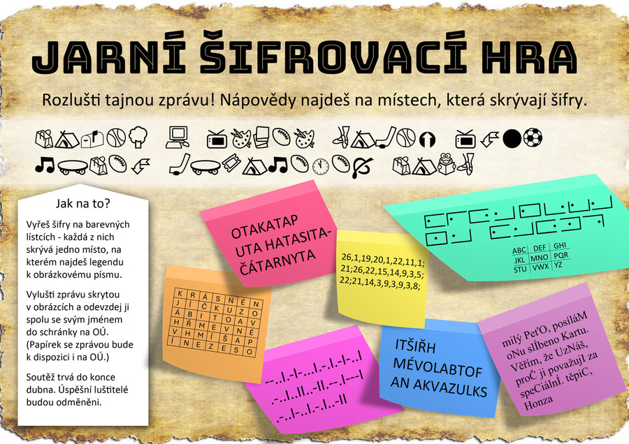 Vylušti zprávu skrytou v obrázcích a odevzdej ji spolu se svým jménem do schránky na OÚ. (Papírek se zprávou bude k dispozici i na OÚ.)