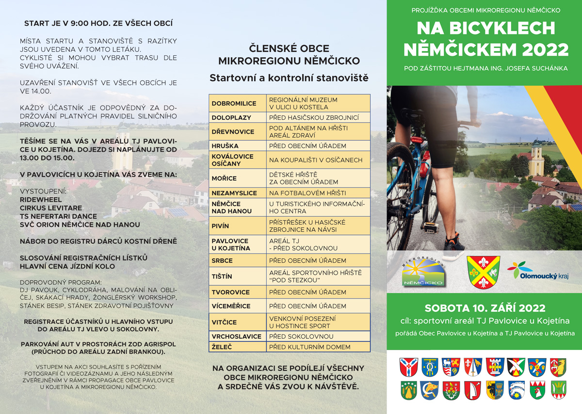 Obec Pavlovice u Kojetína, TJ Pavlovice u Kojetína a mikroregion Němčicko vás zvou na tradiční projížďku obcemi mikroregionu Na bicyklech Němčickem, která se uskuteční v sobotu 10. 9. 2022. Start je v 9:00 ve všech obcích mikroregionu na stanovištích, která najdete v letáčku. Trasa je zcela ve vaší režii. Kontrolní stanoviště budou otevřena do 14:00. Mezi 13:00 a 15:00 si naplánujte příjezd do naší obce, ve které bude připraven dojezdový program. Čeká vás výborné občerstvení, vystoupení vynikajících umělců, doprovodný program a slosování registračních lístků o ceny.