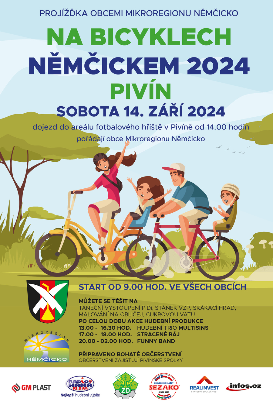 Napumpujte duše, naleštěte ráfky a vydejte se Na bicyklech Němčickem. V sobotu 14. září můžete odstartovat od 9:00 z kterékoli obce Mikroregionu. Nezapomeňte letáček na razítka. A pak už vámi zvolenou trasou, ať už rovnou nebo klikatou - hlavně do Pivína, kde pro vás bude připraven program.