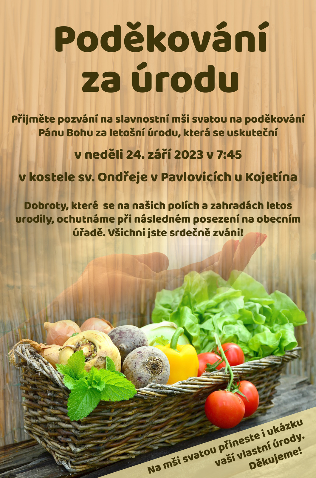 Farnost Pavlovice u Kojetína zve všechny občany na slavnostní mši svatou s poděkováním za letošní úrodu, která se uskuteční v neděli 24. září v 7 hodin a 45 minut v našem kostele. Po mši jste zváni na malé občerstvení na obci, na které můžete přinést na ochutnávku i nějakou dobrotu z vaší úrody.