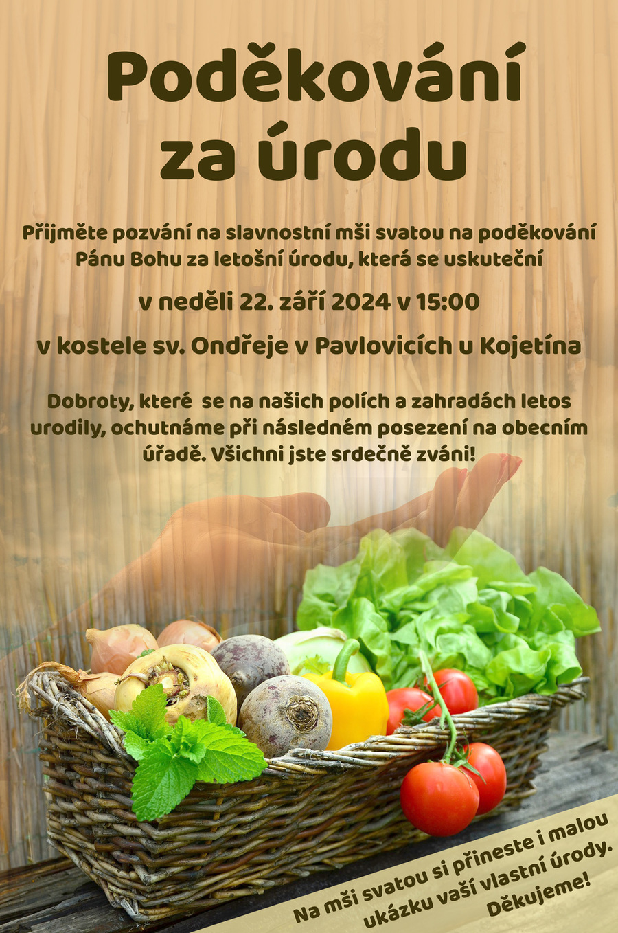 Farnost Pavlovice u Kojetína Vás zve na slavnostní mši svatou na poděkování Pánu Bohu za letošní úrodu, která se uskuteční v neděli 22.září v 15 hodin v kostele sv. Ondřeje v Pavlovicích u Kojetína. Dobroty, které se na našich polích a zahradách letos urodily, ochutnáme při následném posezení na obecním úřadě. Všichni jste srdečně zváni.