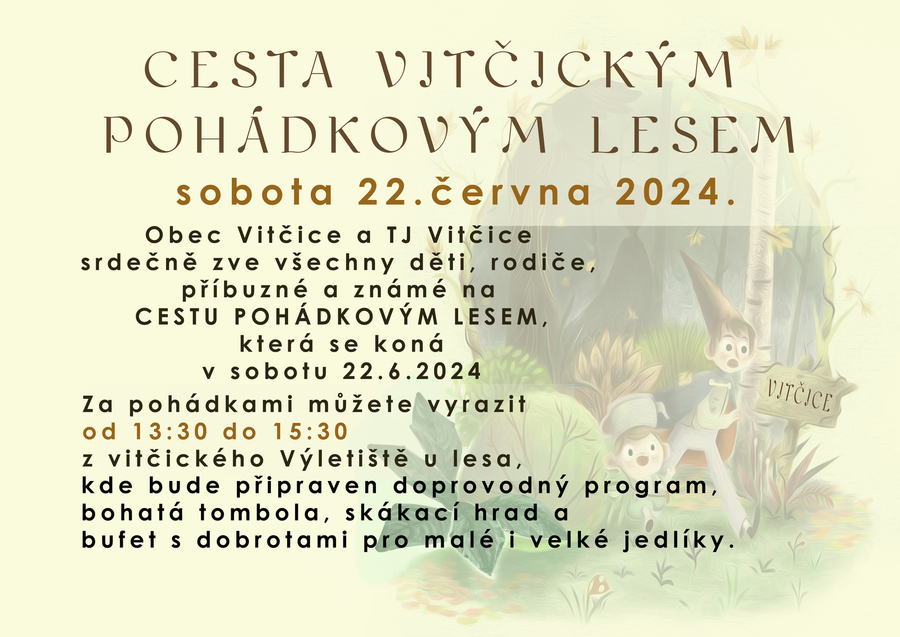 Obec Vitčice Vás srdečně zve na tradiční Pohádkový les, který se bude konat tuto sobotu 22.6. Start bude na hřišti u lesa, brány do lesa budou otevřeny od 13:30 do 15:30. Vstupné dobrovolné, občerstvení zajištěno.