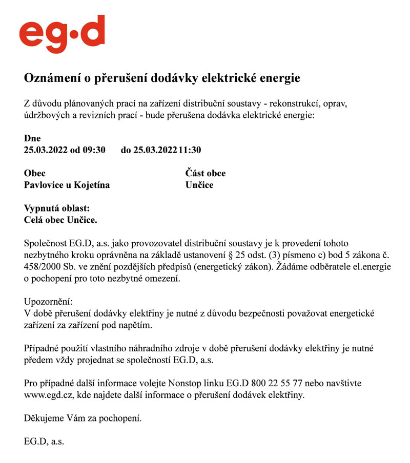 Dne 25.3. 2022 od 9:30 do 11:30 bude v Unčicích přerušena dodávka elektrické energie.