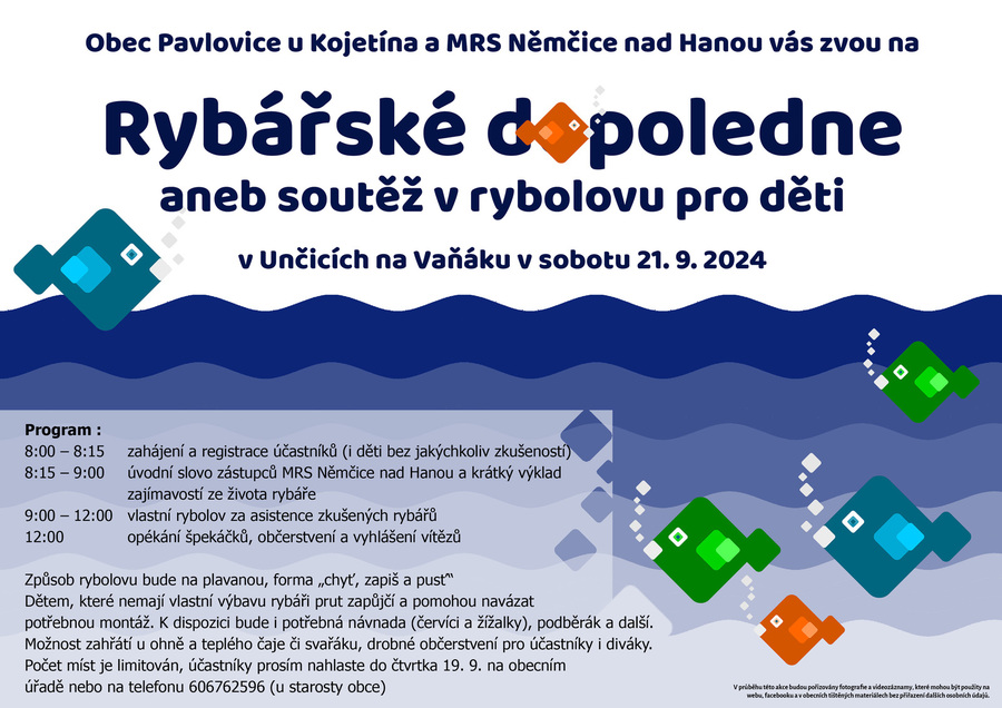 Obec Pavlovice u Kojetína a Moravský rybářský svaz Němčice nad Hanou zve všechny malé rybáře i zájemce o rybolov bez dosavadních zkušeností na rybářské dopoledne do místní části Unčice na Vaňák, které proběhne v sobotu 21.9. od 8 hodiny ranní. Zajištěno je teplé občerstvení, špekáčky, oheň pro zahřátí i výbava k zapůjčení. V rámci akce proběhne soutěž dětí v lovu na plavanou.