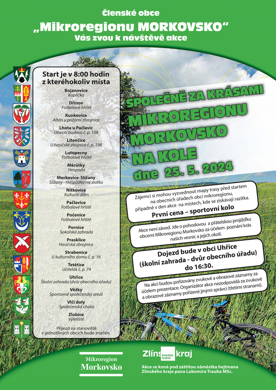 V sobotu 25. 5. 2024 se uskuteční cyklistická akce "Společně za krásami Mikroregionu Morkovsko na kole" se zakončením v Uhřicích. Všichni jste srdečně zváni!
