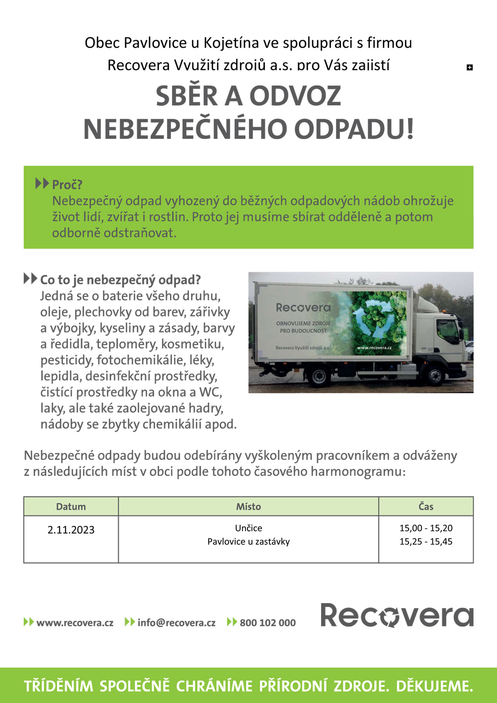 Firma Recovera oznamuje občanům, že ve čtvrtek 2.11. proběhne v obci svoz nebezpečného odpadu a to v 15:00 – 15:20 v Unčicích u zastávky a v 15:20 – 15:45 v Pavlovicích u zastávky.