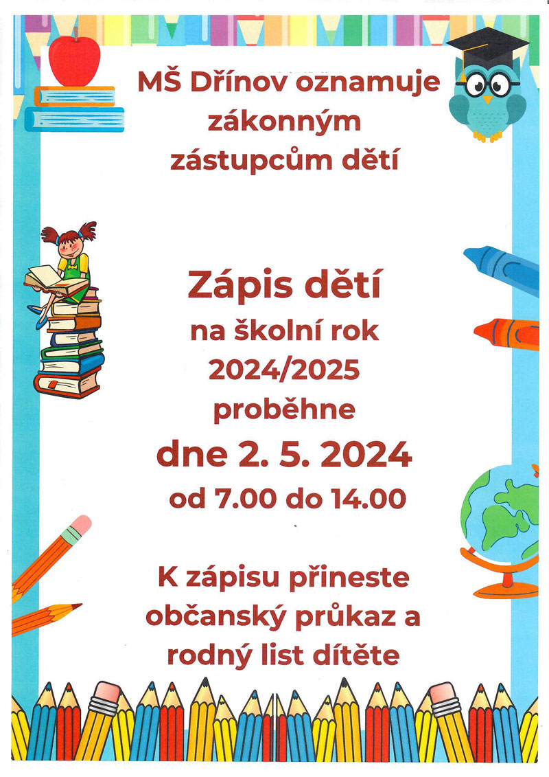 Zápis v MŠ Dřínov proběhne 2. 5. 2024 od 7:00 do 14:00